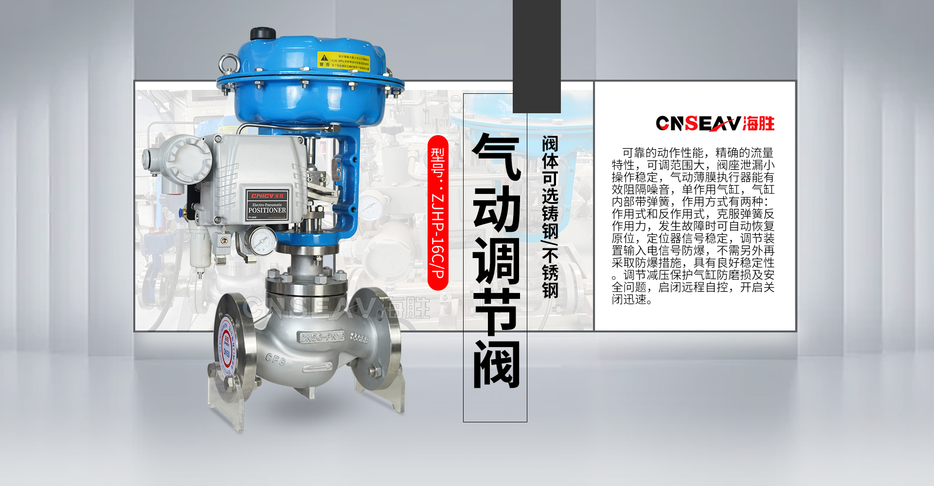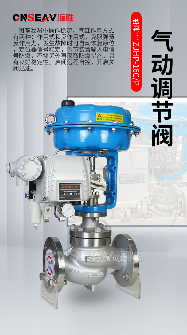 海胜阀门有限公司主导产品有:电动气动智能调节阀、电动温控阀、水力控制阀、中线蝶阀、多功能水泵控制阀等系列产品。年生产能力达5000吨以上。本公司在全国各主要大城市均设有办事处,产品已覆盖全国各地,并一直出口南美、北美、欧洲和东南亚各国,广泛用于给排水、电力、石化、冶金等行业。